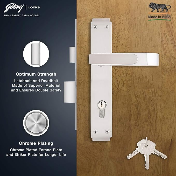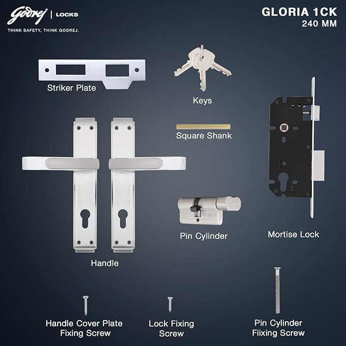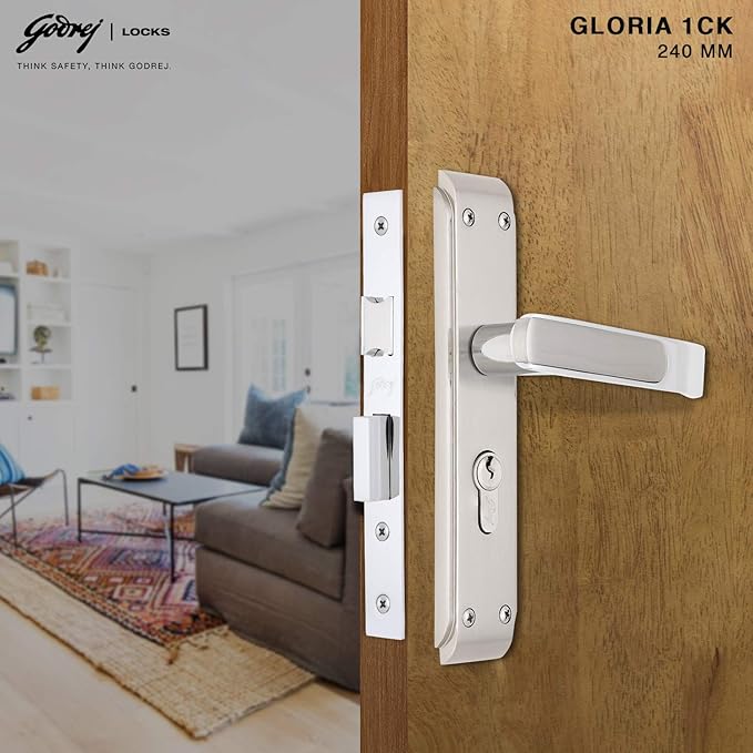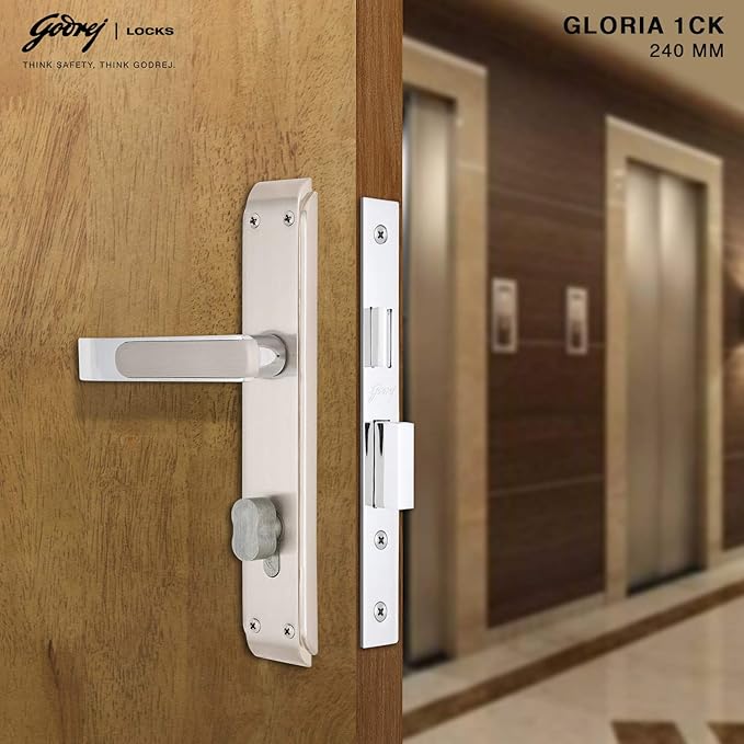 The GLORIA 240mm 1CK door handle set, featuring a Victor Cylinder and finished in Satin Steel, offers durable strength and security with a sleek, modern look made to last.