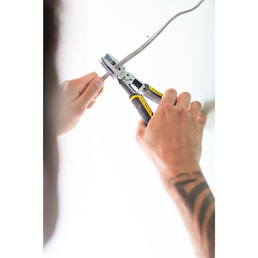 The STANLEY FATMAX 6-IN-1 Universal Plier is a versatile tool designed to meet a variety of needs with precision and ease. It features a wire stripper capable of handling three sizes (2.5mm, 4mm, and 6mm) and a multi-point wrench for tightening hexagonal nuts and bolts. The plier also includes bolt croppers for M3.5 and M5 bolts, ensuring accurate cuts every time. Its universal jaw with serrated gripping and a hardened reaming edge make it ideal for smoothing pipework burrs. The universal cutting edge is designed to cut wires up to 2.0mm Piano Wire, while the bi-material ergonomic grip ensures comfort and control. Made from induction-hardened, drop-forged CR-V steel, this plier is built for durability and long-lasting performance.