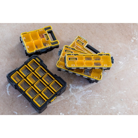 The Stanley Tools FatMax Flip Bin Organiser has 12 removable, levered storage compartments, providing storage for small parts, components or accessories. Its lid is made from transparent polypropylene, making it virtually unbreakable whilst allowing a full view of the contents.