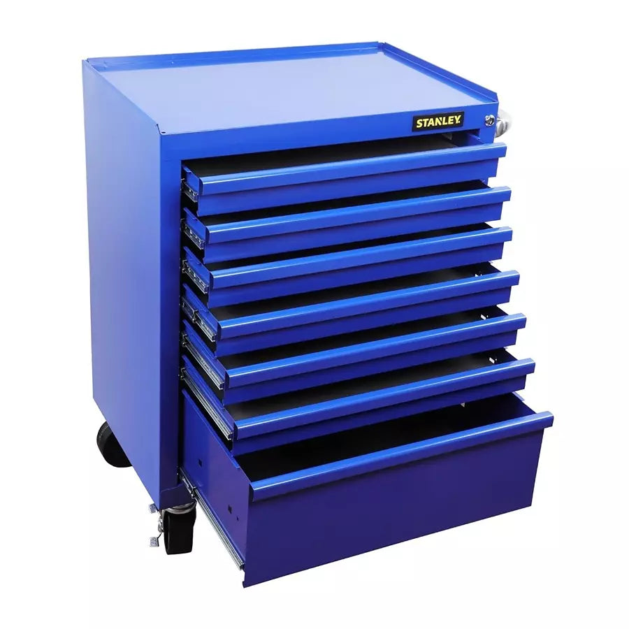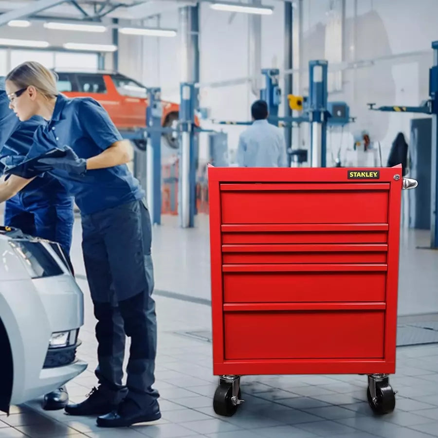 The STANLEY STST74422-8 5-Drawer Eco Roller Cabinet in Red is a durable and versatile storage solution designed to meet the needs of professionals and DIY enthusiasts. With its sturdy construction and ample storage capacity, this roller cabinet offers convenient organization and easy access to tools and equipment in workshops, garages, and other workspaces. With its vibrant red color, the STANLEY STST74422-8 roller cabinet adds a touch of style to any workspace while ensuring high visibility. Crafted from sturdy steel, the cabinet is built to withstand heavy-duty use in demanding work environments, ensuring long-lasting performance. Featuring five spacious drawers of varying sizes, the roller cabinet provides ample storage space for tools, parts, and accessories of different shapes and sizes. Equipped with smooth-gliding ball-bearing slides, the drawers allow for effortless opening and closing, even when fully loaded. Designed with convenience and versatility in mind, the STANLEY STST74422-8 roller cabinet comes with a lockable design to secure tools and keep them organized. Additionally, the top surface can serve as a workbench or extra storage space for frequently used tools or equipment. Equipped with four sturdy caster wheels, including two swivel casters with brakes and two fixed casters, the roller cabinet can be easily maneuvered around the workshop for maximum flexibility and convenience. The durable wheels ensure smooth and stable movement, even when transporting heavy loads. Overall, the STANLEY STST74422-8 5-Drawer Eco Roller Cabinet in Red offers a reliable and efficient storage solution for professionals and DIY enthusiasts. Its durable construction, ample storage capacity, and convenient features make it an essential addition to any workshop or garage, providing convenient organization and easy access to tools and equipment whenever needed