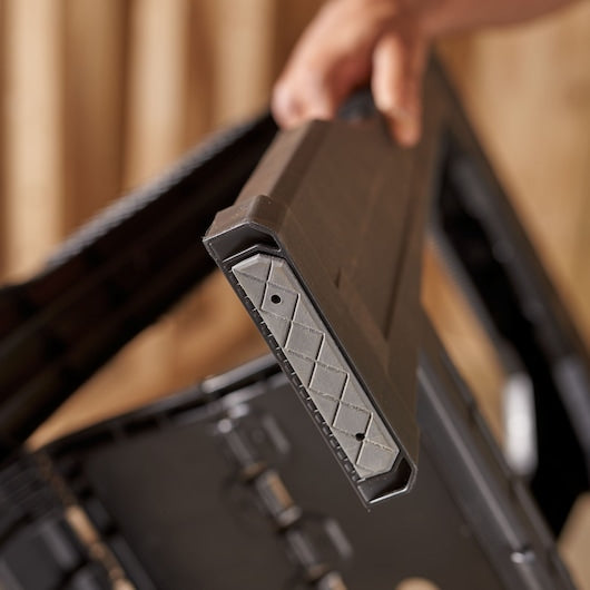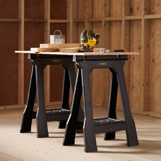 The STANLEY Jr. Folding Sawhorse secures your sawing surface and is collapsible for easy transporting and storage. When used as a pair, this lightweight and sturdy sawhorse twin pack can hold 800 lbs. Built-in work holding channels keep materials securely in place and bottom tray allows for easy tool storage while working.